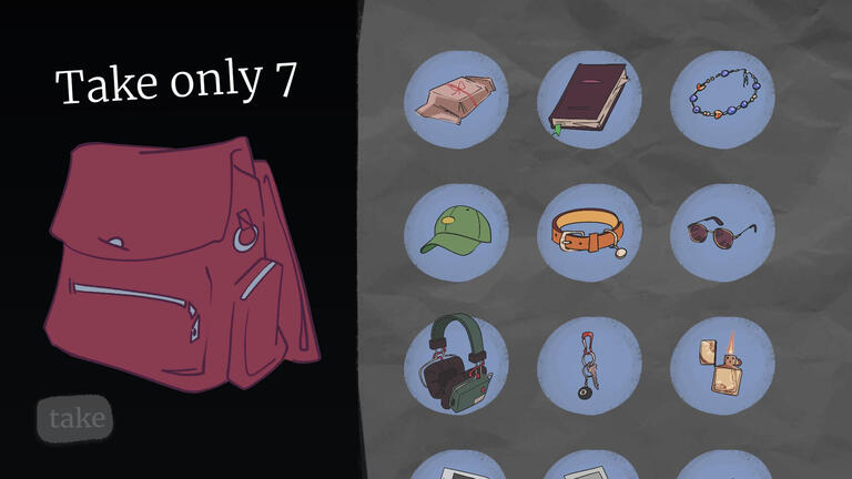 You're in a journey. From where? To where? You only get to choose 7 items to keep. But what if they're too heavy to let you go on?Playable on browser